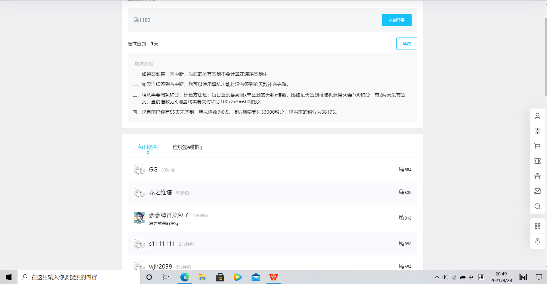 ?网页右边,签到排行顶上