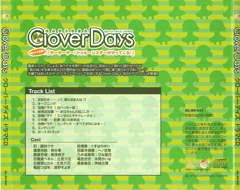 | タイトル | 【妹ラヂオ本家 やーやーやートゥルーシスターがやってくる】 ①・お知らせ……って、誰だおまえは!? ②・オープニング ③・投稿ドラマ『白ヘッキー姫』 ④・妹検定試験~お兄ちゃんの起こし方~ ⑤・投稿ドラマ『エンゼルとヤサグレーテル』 ⑥・小休憩~新妻(笑)のお茶会~ ⑦・投稿ドラマ『シンデレラ~全てがMになる~』 ⑧・エンディング ⑨・Clover Heart's -New days recording- game ver. | ||