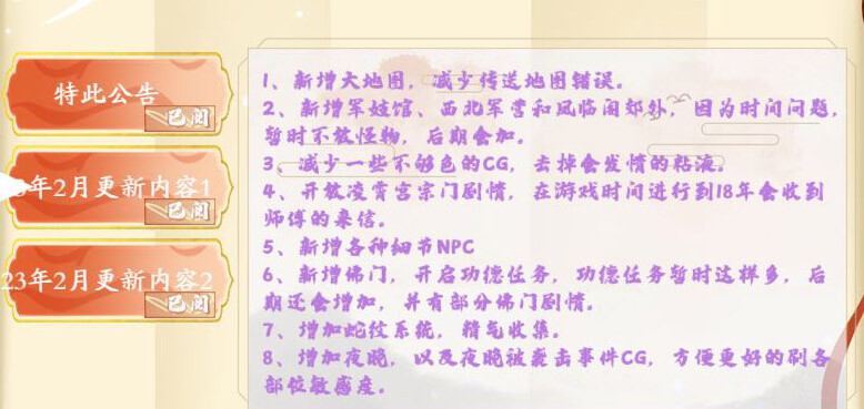 增加大量新剧情,新大地图,军技营,佛门等地方和各种新エロ项目。