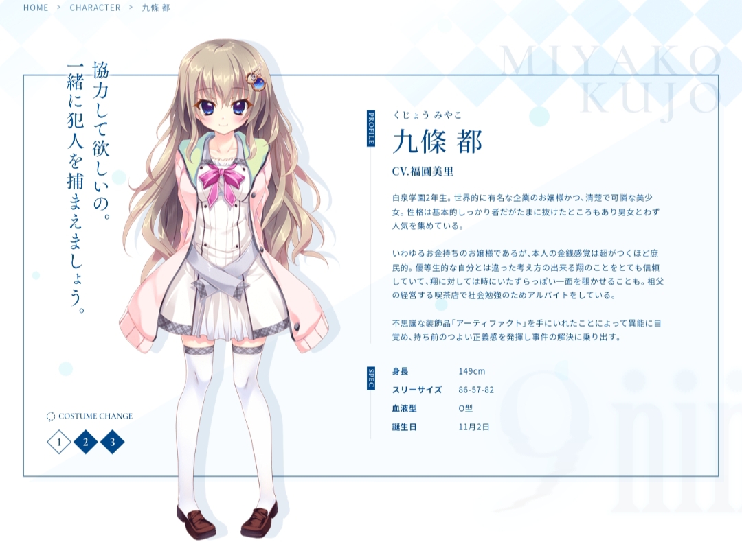 九條都:Vol.1的女主角,翔的同班同學,是世界有名的企業「可樂娜集團」的千金,但本人對金錢的使用十分錙銖必較。為了累積社會經驗,因此在爺爺經營的咖啡廳「Nine Ball」打工,打工時會綁著雙馬尾並戴眼鏡,四名女主角中唯一會料理的人,在每條路線中都會展現自己的手藝。與翔一起經歷過學校裡發生的失火事件後對他十分信任和尊敬。