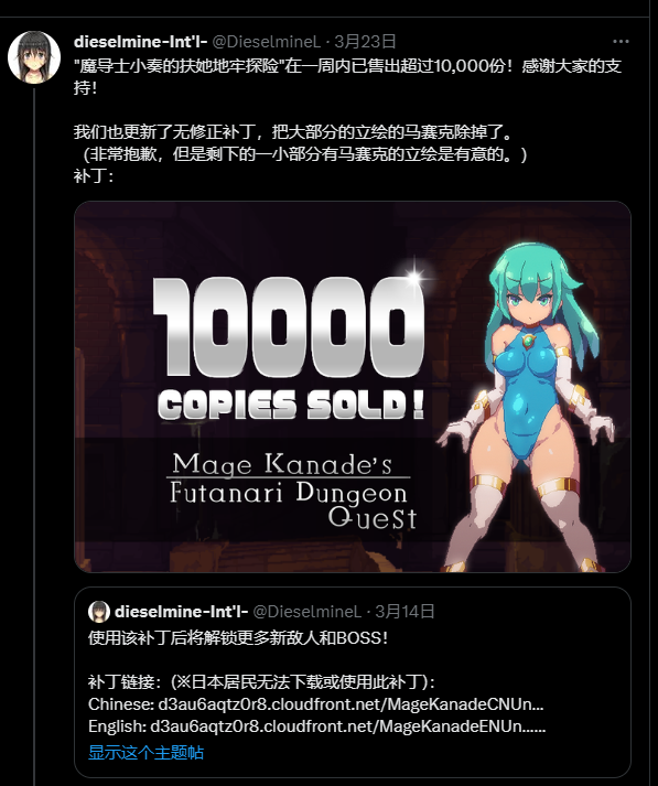 游戏正式版阉割了一些cg和怪,但是社团在推上公布了补丁,无码!新cg!
