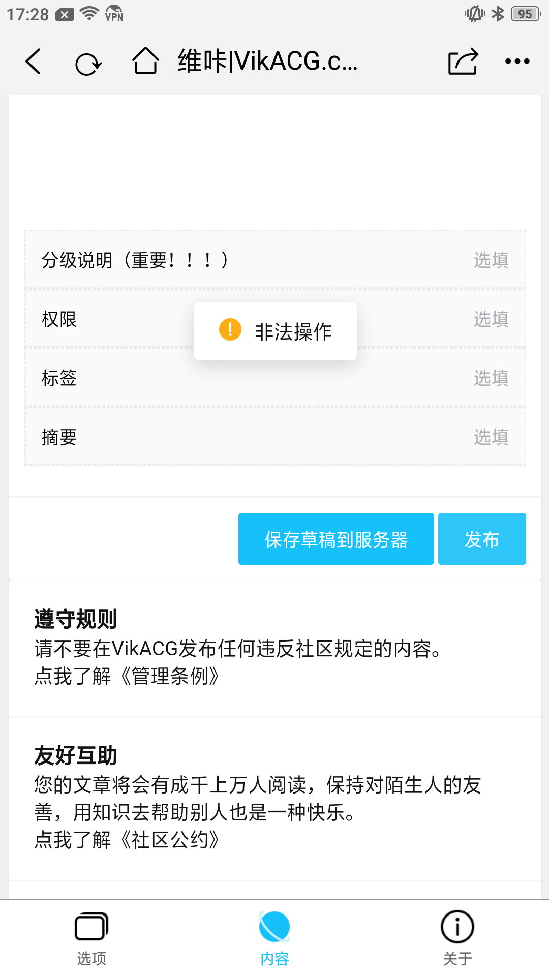 之后换一下手机依旧是非法操作(难道是我文章内容非法吗),新建一个新文章还是显示非法操作