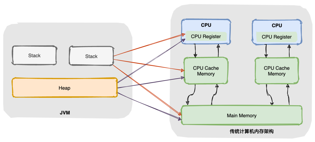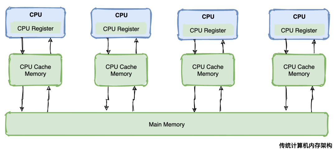由于主存与 CPU 处理器的运算能力之间有数量级的差距,所以在传统计算机内存架构中会引入高速缓存来作为主存和处理器之间的缓冲,CPU 将常用的数据放在高速缓存中,运算结束后 CPU 再讲运算结果同步到主存中。 使用高速缓存解决了 CPU 和主存速率不匹配的问题,但同时又引入另外一个新问题:缓存一致性问题。