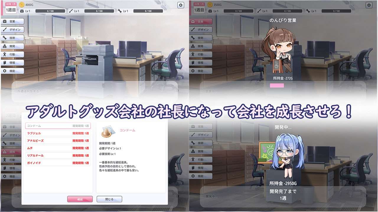 升级、开发产品、与你的女主角一起测试它们,并扩大你的公司!