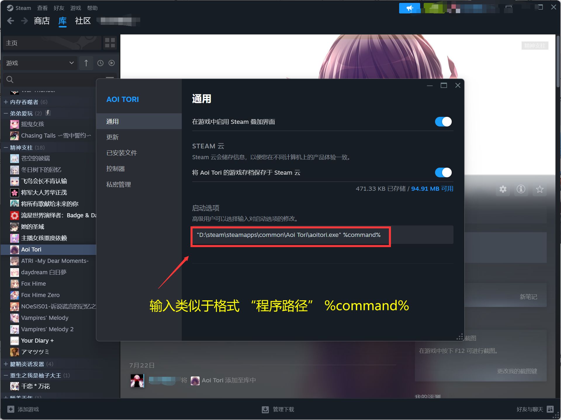 在 游戏界面——设置——属性——通用——启动选项 ,我们可以看到一个命令窗口,在窗口中以类似格式 "D:\steam\steamapps\common\Aoi Tori\aoitori.exe" %command% 输入命令即可。(记得%前面有空格!)