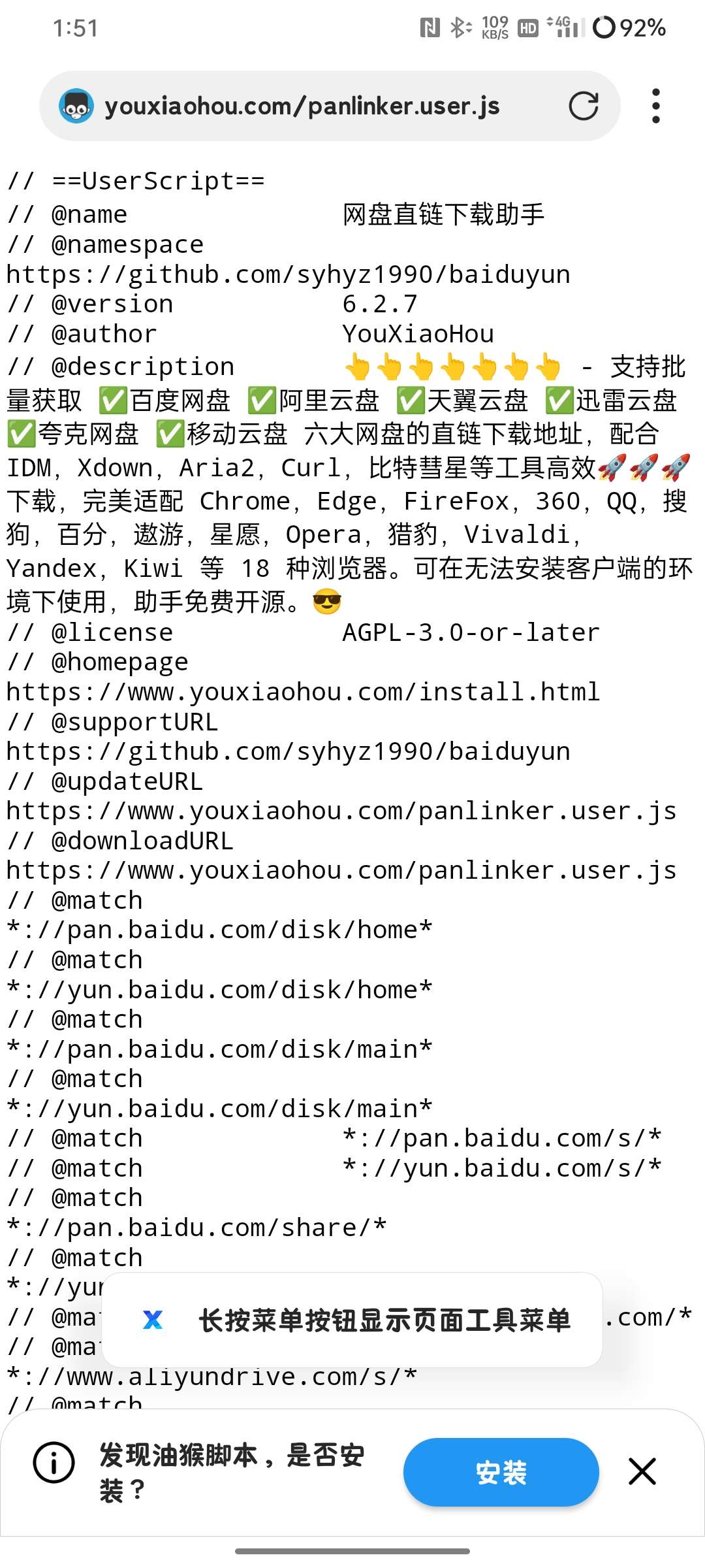 下载“X浏览器”,进入浏览器后输入网址,安装油猴脚本