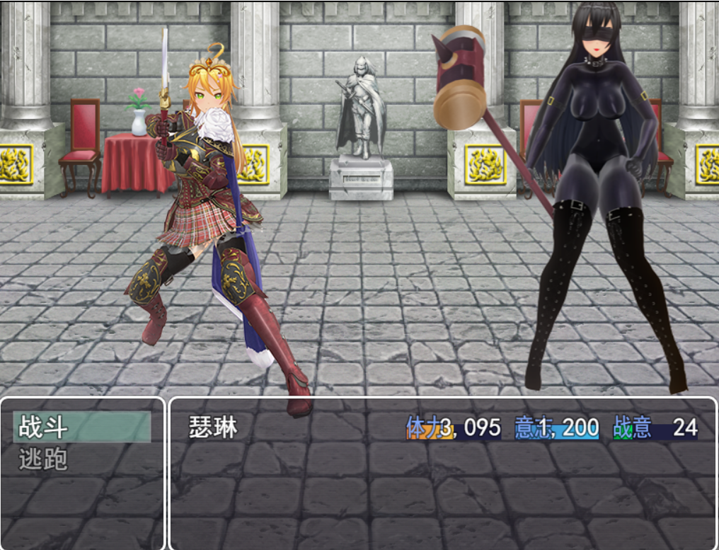 在此基础上,我实际上是想做出那种,女主角在战斗中逐步落入下风,然后意志力被慢慢消磨,最后在挣扎中被击败,然后在反复的折磨/拷问和凌辱中失去意志变成奴隶/家畜/玩具的过程,也就是俗称的“解题要写过程,不然不给分“,不过想法是很美好,现实还是很骨感的,我只能说在我有限的精力和技术力之中,我尽可能做出了这样的感觉,但是这个过程能给多少分,满分100我最多给自己50,大概是这个样子。