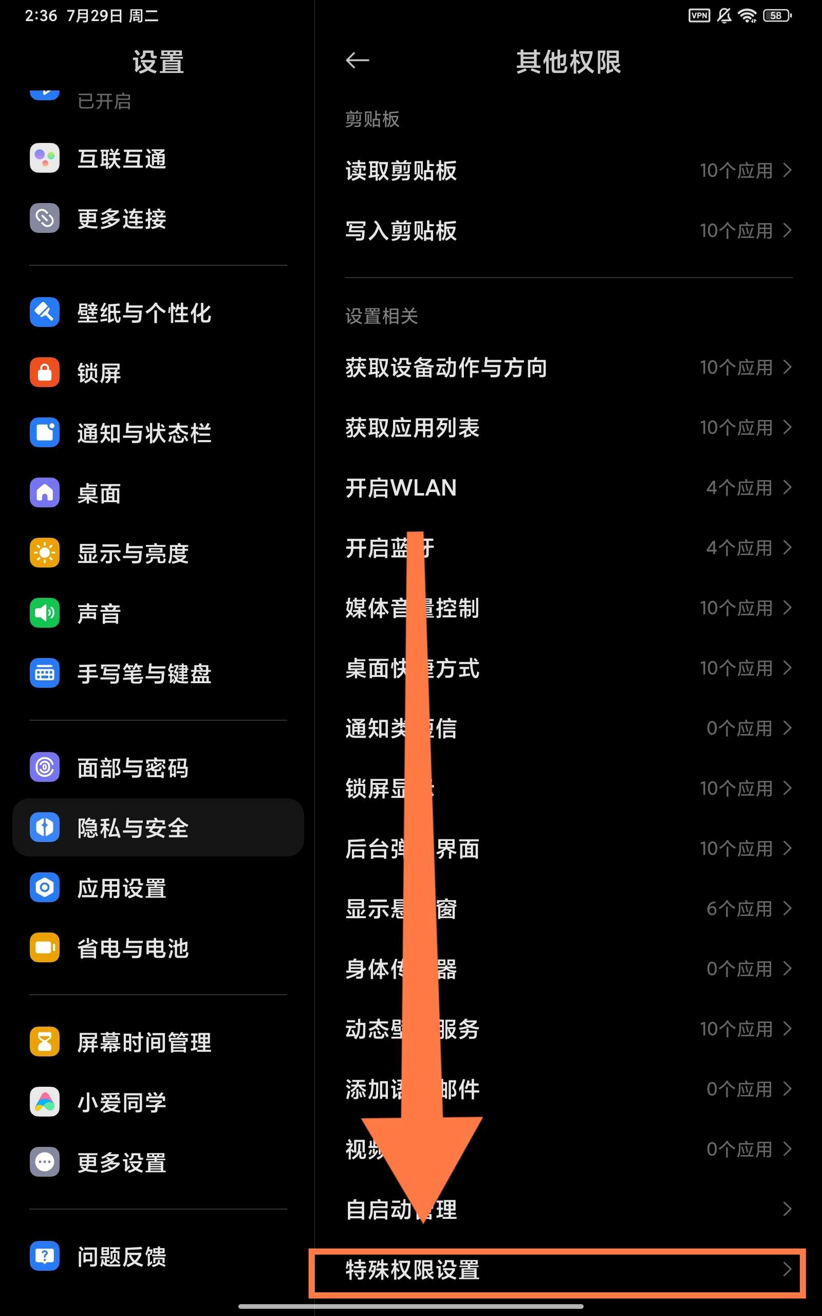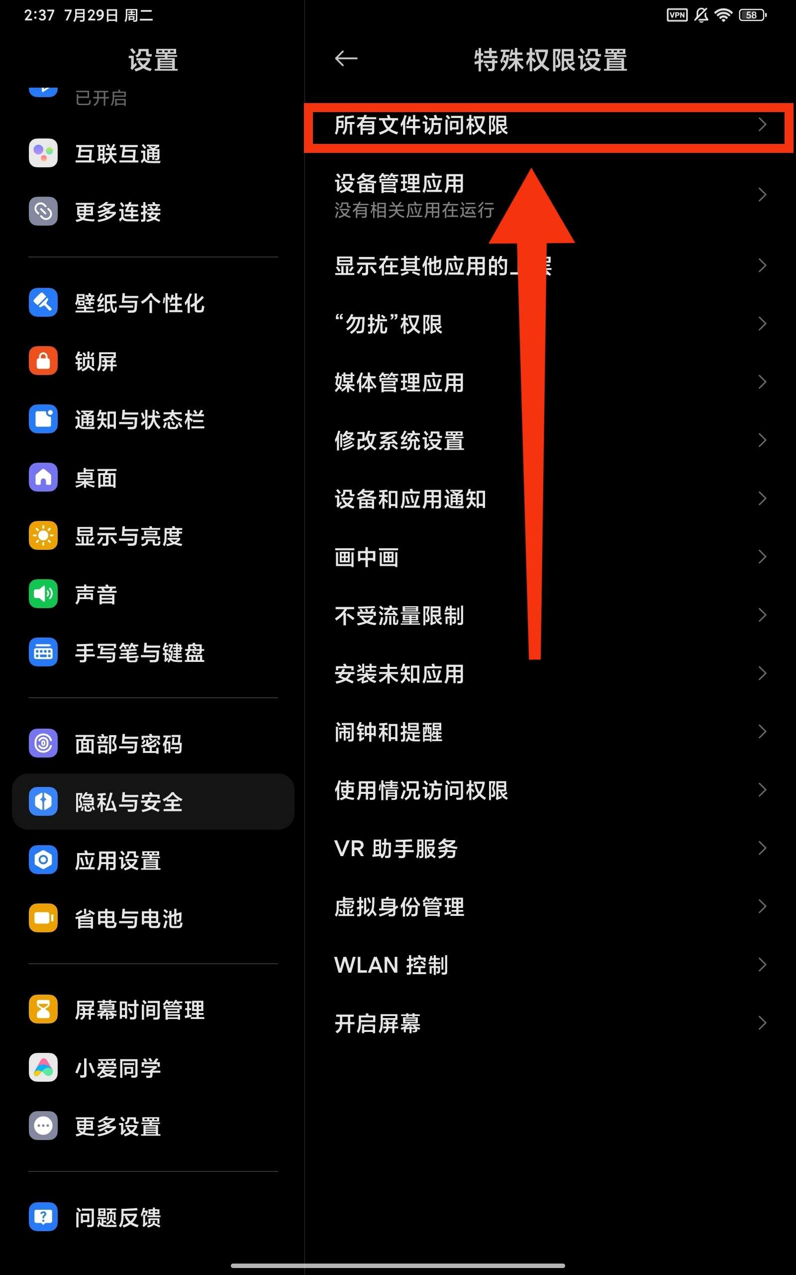 然后找到所有文件访问权限(偏爱酱用的是小米平板,在这里的顺序为:特殊权限设置——所有文件访问权限——维咔——授予管理所有文件的权限,如果不是小米的话可以上百度搜索:xx手机的所有文件访问权限在设置的哪里)