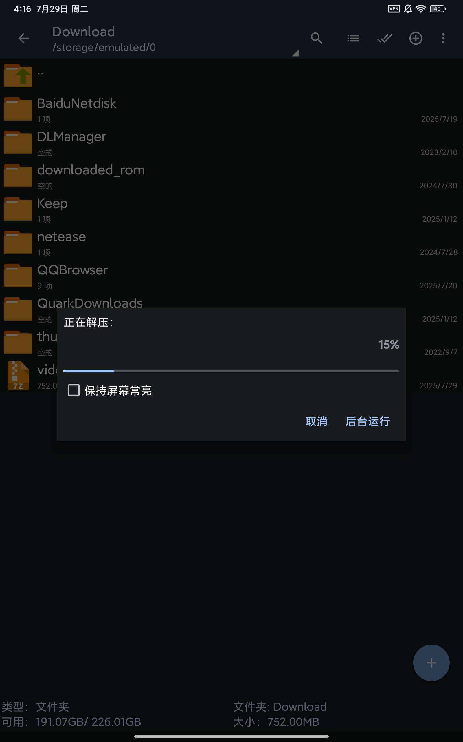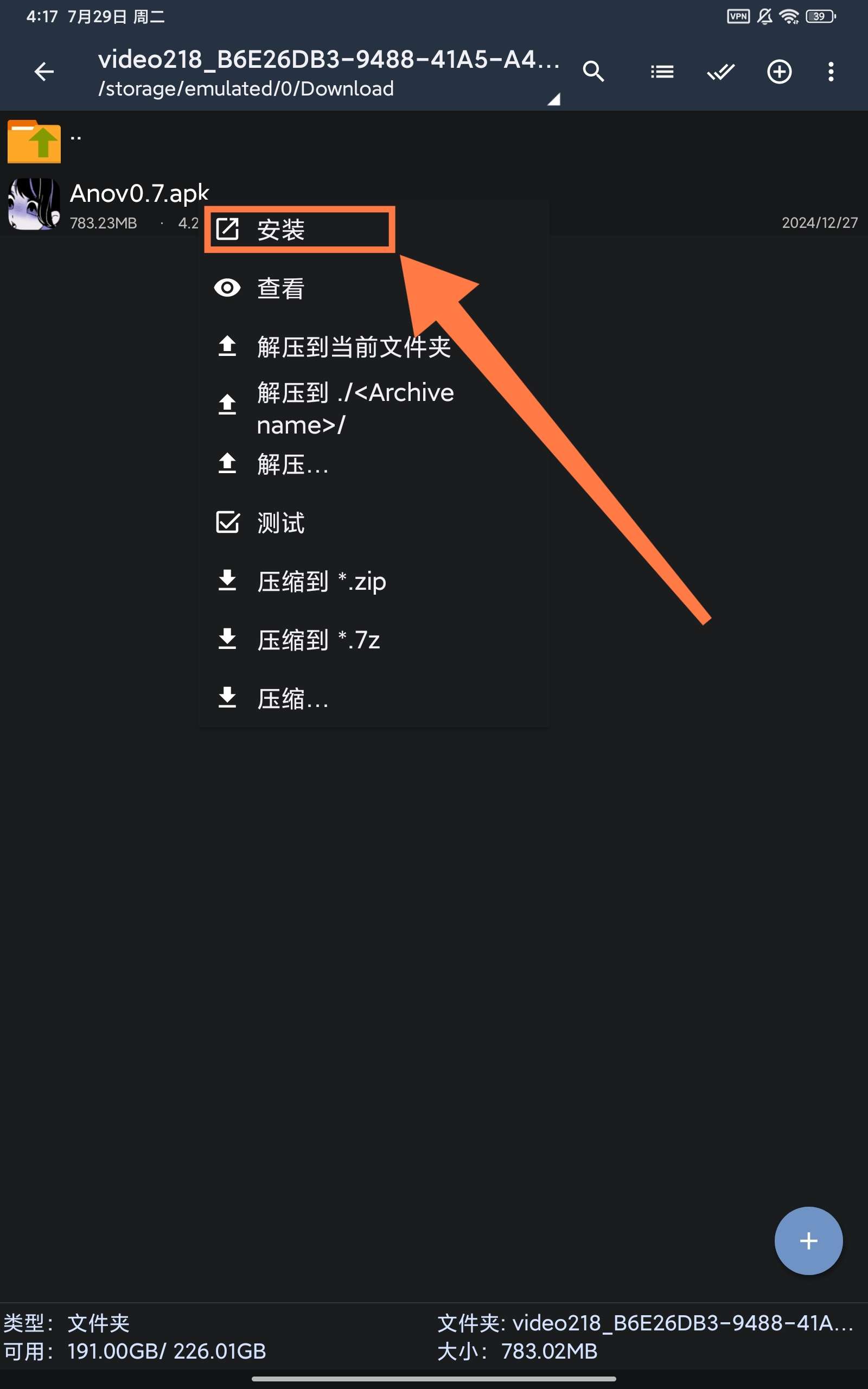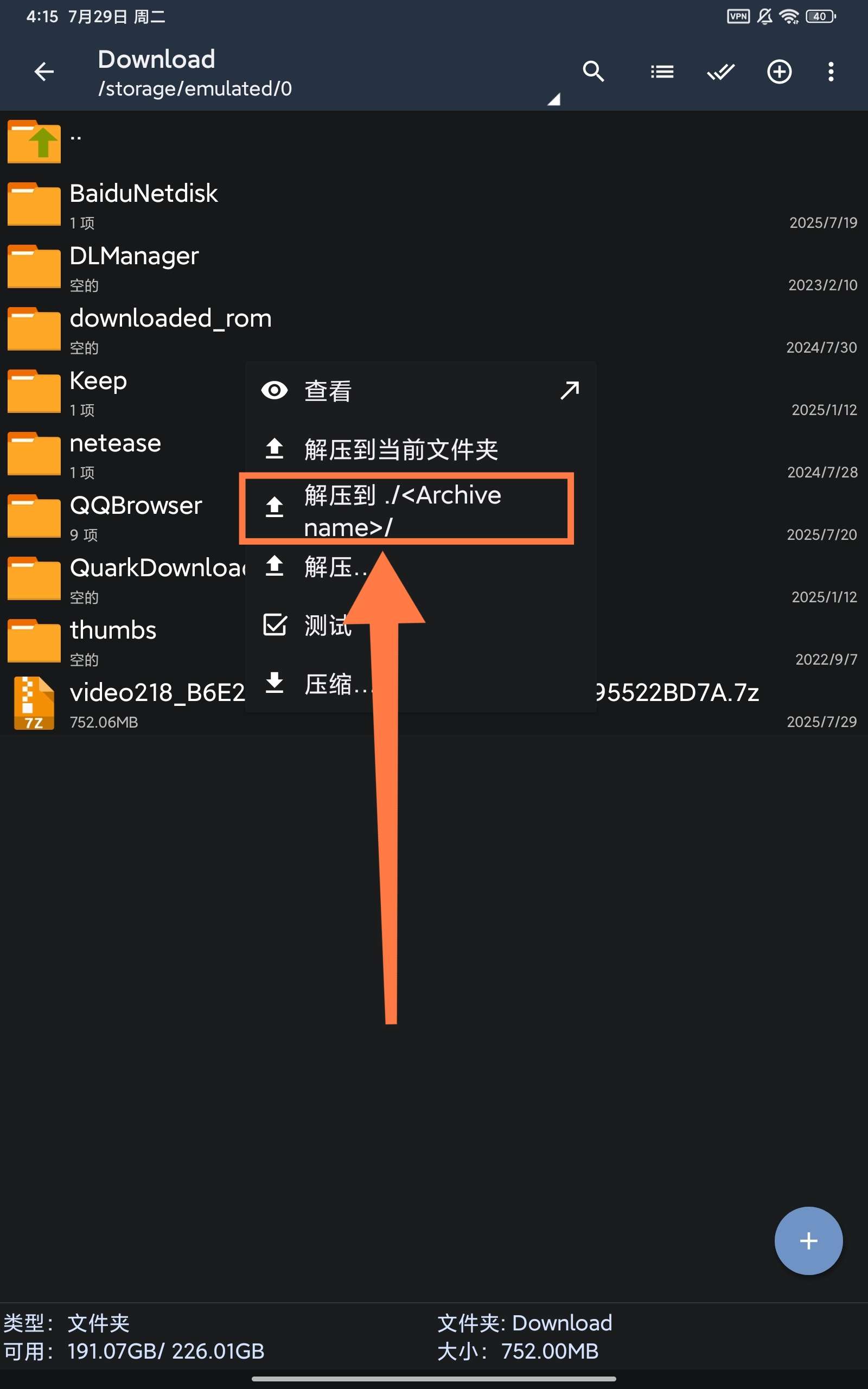 首先返回下载管理页面,点击这个下载好的video,并用解压软件打开