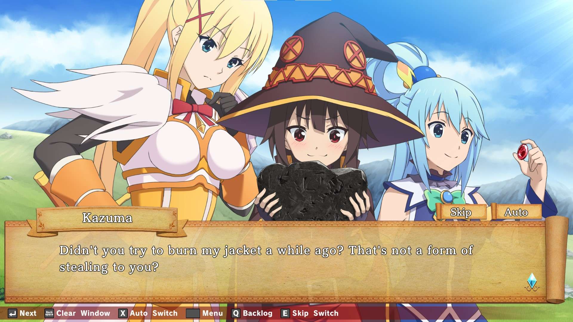 The story of Kono Yokubou no Ishou ni Chouai wo features the KonoSuba party, who during one of their usual quests, find a cursed tablet that lets its user freely generate clothes. The cast all get cursed with personality-reverse. Darkness turns into a sadistic queen, Megumin turns into a lolita and starts a Lolita Alliance, and Aqua turns into an actual goddess-like person. The characters will need to make and wear specific clothes with the tablet to break the curse. It’s a game where you can enjoy typical comedy situations of KonoSuba along with the cast acting out of character and wearing different costumes. Hence the Japanese subtitle, which can be translated to “Love For the Costumes of Desires".