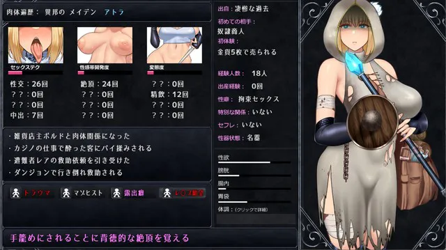 体力、筋力、技术、知性、话术、美貌的基础状态值可自由分配培初始选择的“出身”与三项“原初体验”将赋予诸如“暴露癖”、“酒乱”、“肛门脆弱”、“受虐狂”等多样的初始能力。能力亦会根据游玩倾向新增,并与反映在立绘上的装备品相结合,可实现如“肛门脆弱的高洁处女女骑士”或“邪恶的淫乱变态修女”等广泛的构筑与角色扮演。