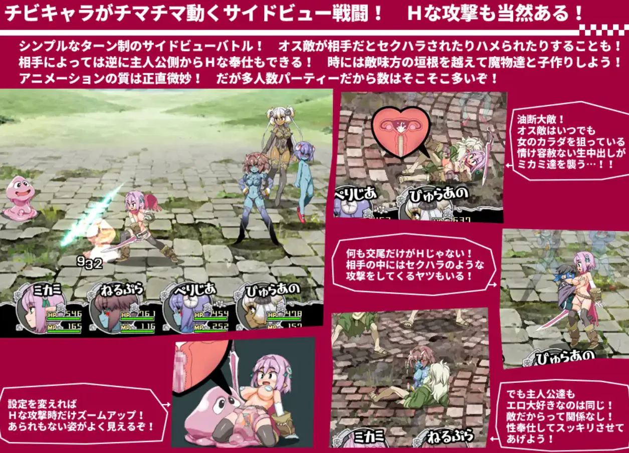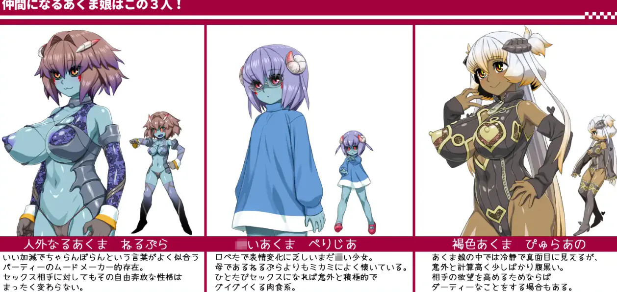 超过百个的事件,女主可以自由切换成人\小孩两种形态,三个恶魔娘队友也有丰富的事件在战斗中还有小人动画!