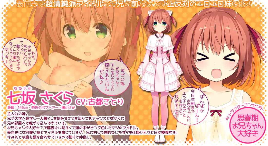七坂 さくら(ななさか さくら) CV:古都ことり 身高:145cm·棕色波波头·胸部较小 主人公的妹妹。 得知哥哥要上大学开始一个人生活,就兴奋地直接搬进了哥哥的房间。 非常喜欢哥哥?是个天真烂漫、脑子里都是粉红色的真·偶像。 表面上扮演着可爱的妹妹和偶像,但每天都在琢磨着如何对哥哥进行性骚扰。 和澄江见过很多次面,关系还不错。 |