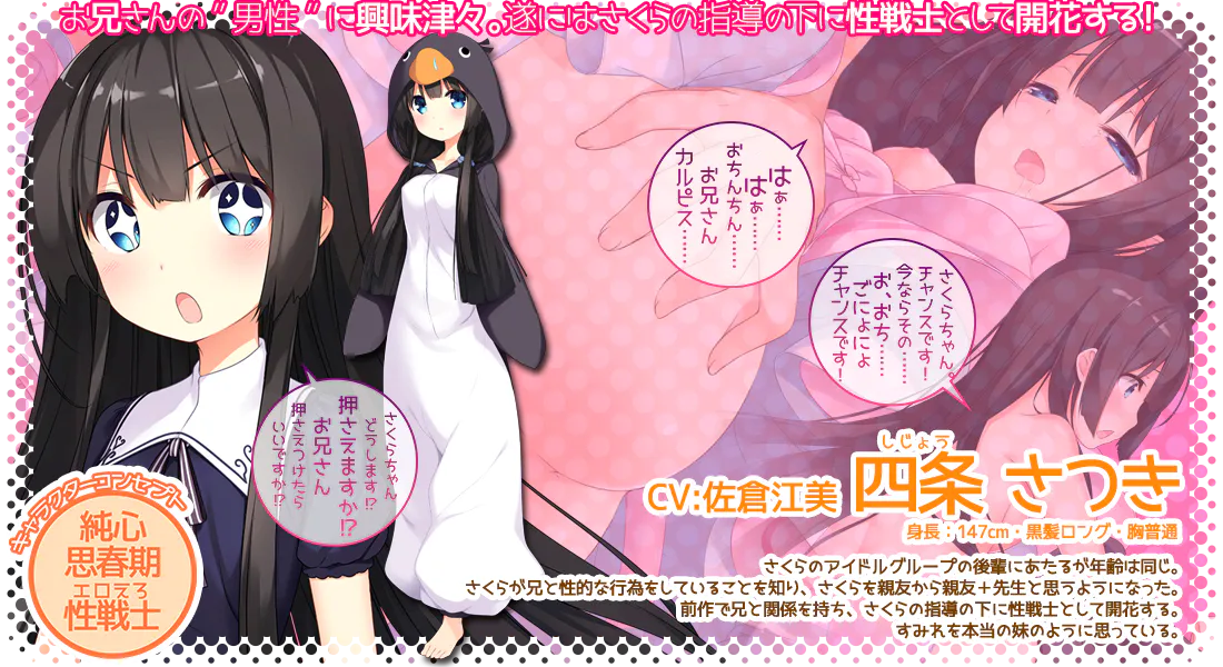 四条 皋月CV:佐仓江美 身高:147cm·黑发厚嘴唇·胸部普通 是樱的偶像组合的后辈,但年龄相同。 得知樱和哥哥有性行为后,将樱从挚友变成了挚友+老师。 在前作中与哥哥发生了关系,并在樱的指导下作为性战士觉醒。把堇当成亲妹妹一样看待。 |