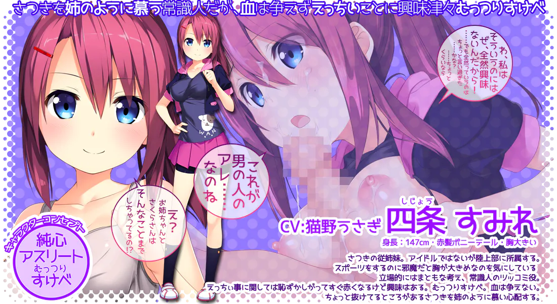 四条堇CV:猫野ラさぎ 身高:147cm·红发马尾辫▪大胸 皋月的表姐妹。虽然不是偶像,但隶属于田径部。 因为胸部太大,觉得妨碍运动而感到在意。立场上是想法正常、有常识的吐槽役。 对于正经的事情会害羞,马上脸红,但其实很感兴趣。好色的样子和皋月一样。血脉相承。像姐姐一样仰慕并担心有点脱线的皋月。 |