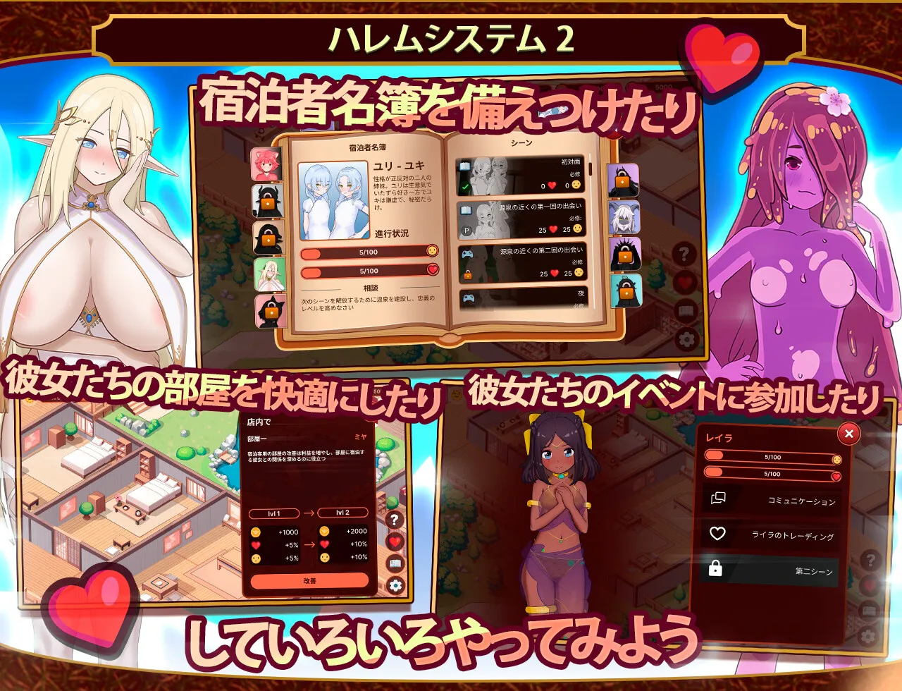 • 在异世界建造属于自己的酒店,与住宿的客人们愉快相处。目标是诱惑她们,建立后宫。