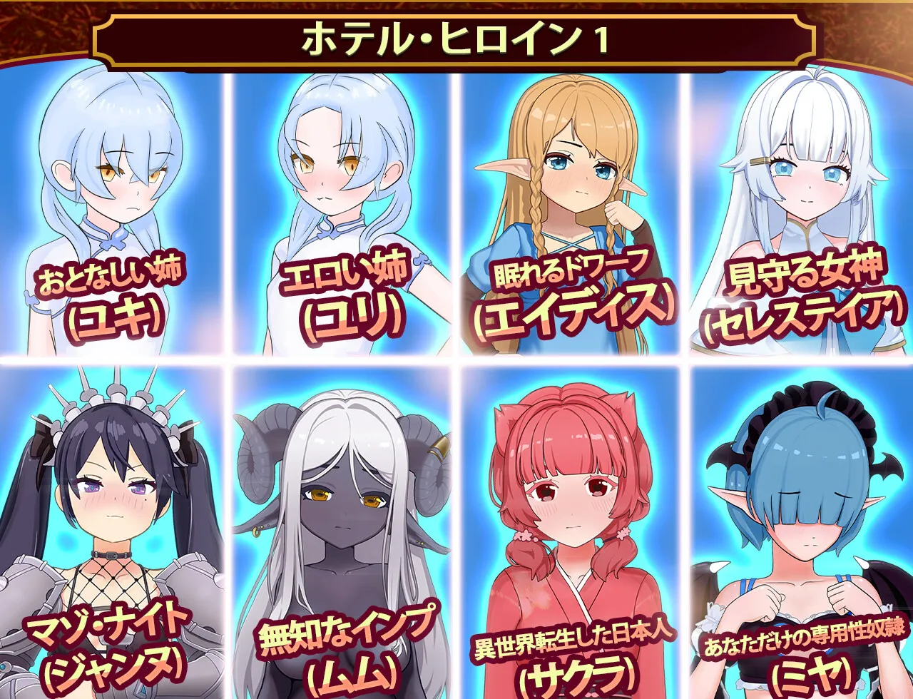 •《我的异世界酒店》是一款模拟游戏。在异世界转生后,通过收集资源发展酒店,与住宿的客人相遇,并通过交流加深关系。请享受色情场景的解锁。、
