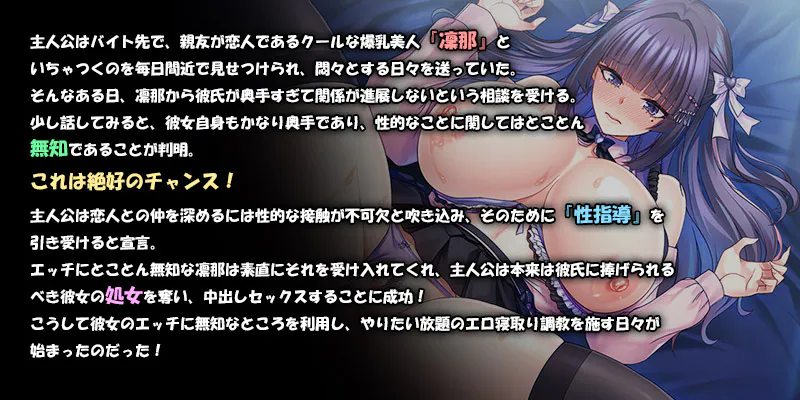 故事介绍主人公每天在打工的地方,眼睁睁地看着好友和他的性感冷艳爆乳女友“凛那”卿卿我我,内心苦闷不已。某天,凛那向他倾诉,说男友太过木讷,两人关系毫无进展。稍微聊了一下,发现她本人也相当内向,对性方面的事情更是完全一无所知。这可是绝佳的机会!主人公灌输给恋人,要加深关系性接触不可或缺,并宣言要承担“性指导”。对性一无所知的涛那很听话地接受了,主人公成功夺走了原本应该献给男友的她的处女之身,并成功内射!就这样,利用她对性的一无所知,为所欲为地进行着色情寝取调教的日子开始了! |