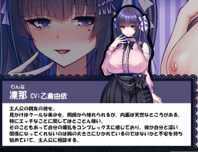 凛那 CV:乙仓由依 主人公亲友的女朋友。 外表是冷酷的美少女。虽然被周围的人憧憬,但内心有些天然呆。 尤其是在色情方面的事情上非常迟钝。 也因此对自己的巨乳感到自卑,开始不安地认为男友不和自己有更深的关系是因为被自己的胸部吸引,于是向主人公倾诉。 |