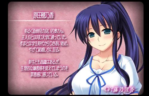 原王穂刀香 CV:藤乃理香 开朗且乐于助人的年轻主妇。 与主人公是同一所大学的校友。 从学生时代开始就和孝彦交往, 最终步入婚姻殿堂。 虽然也认识干生, 但总会感到生理上的厌恶, 为此感到内疚。 |