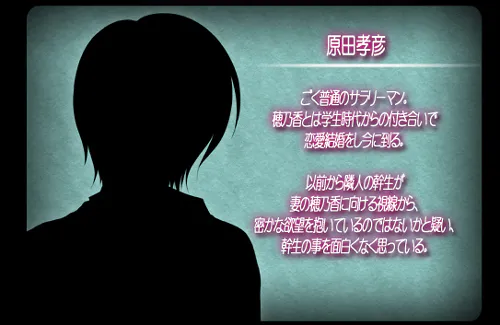 原田孝彦 非常普通的上班族。 和穂刀香从学生时代就开始交往, 最终结为恋爱婚姻。 一直以来都觉得邻居干生 看向妻子穂乃香的眼神中 充满了隐秘的欲望, 因此对干生感到不悦。 |