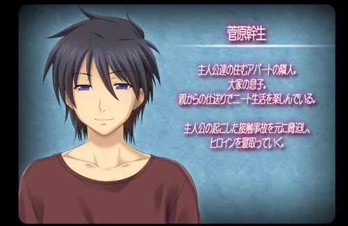 菅原幹生 主人公们所住公寓的邻居。 房东的儿子。 靠着父母的资助过着啃老的生活。 以主人公引发的交通事故为把柄进行威胁, 并逐渐夺走主人公的妻子。 |