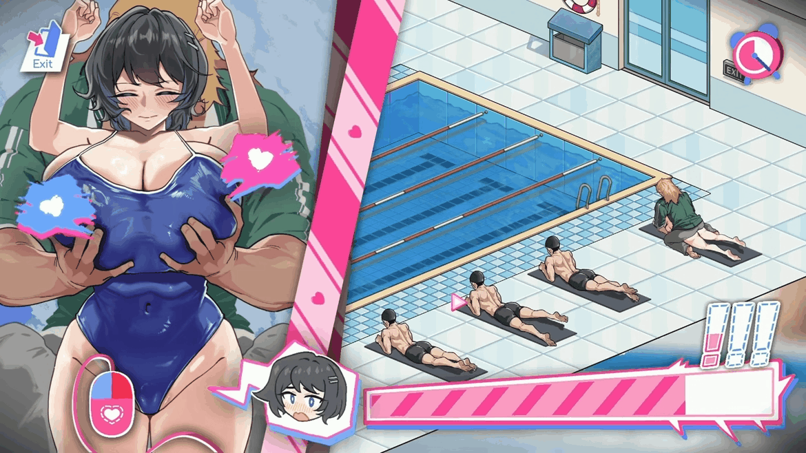每天分为两个时段,每个时段可以消耗行动值,进行不同的行动。可以专心经营游泳池,让游泳池的生意变好,击败竞争对手;同时透过不同的小游戏与女主角们更加亲近,最后将他们彻底夺走。