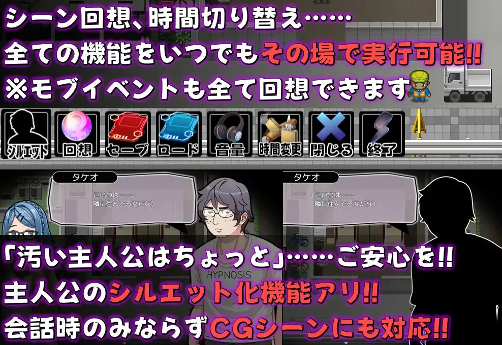 切换昼夜探索街道,看到女性(路人)就侵犯她们来获取点数。