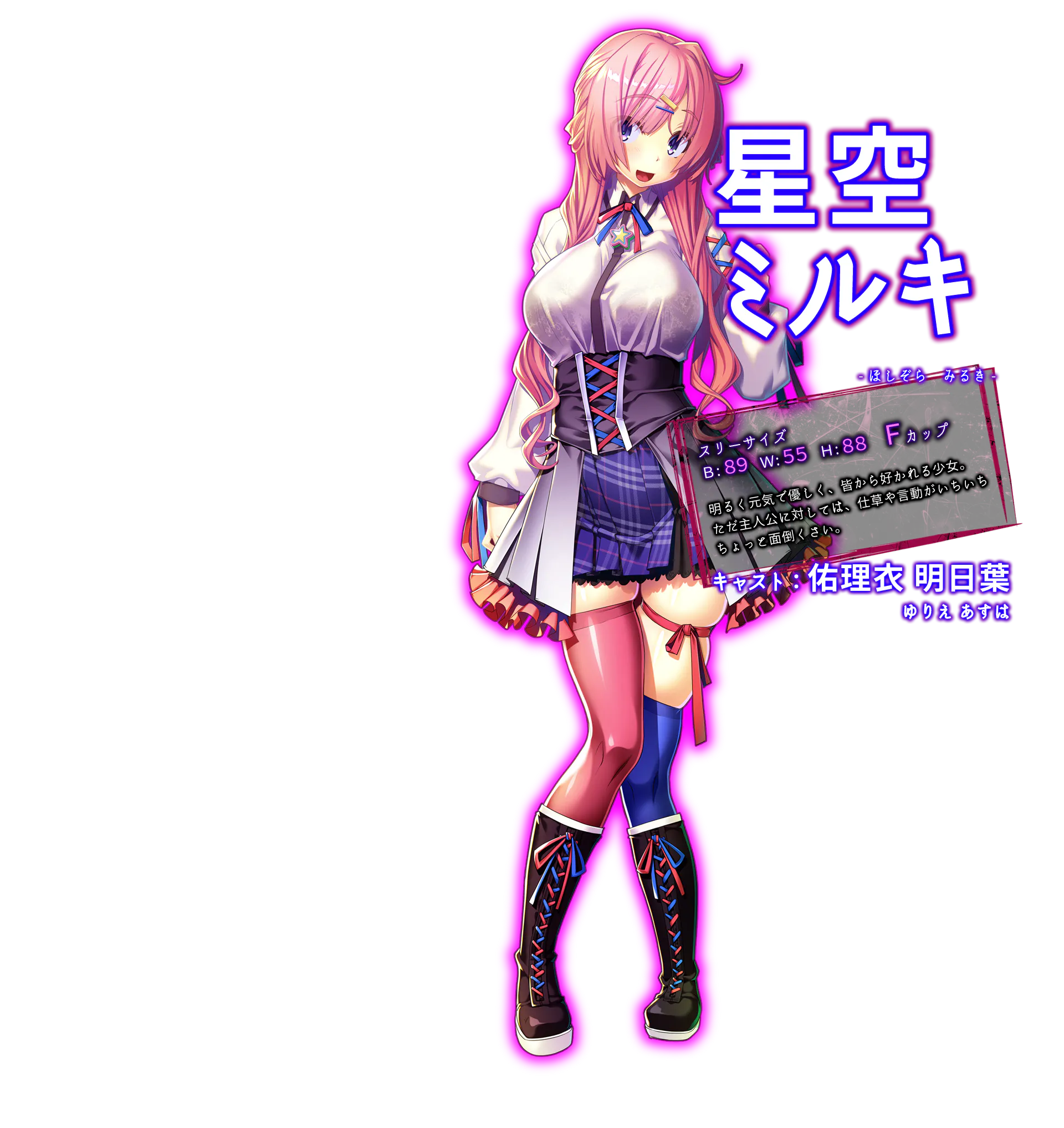 星空 美留希 (星空 ミルキ) 三围:B-89 W-55 H-88 开朗阳光的温柔性格,被大家所宠爱的少女。 |