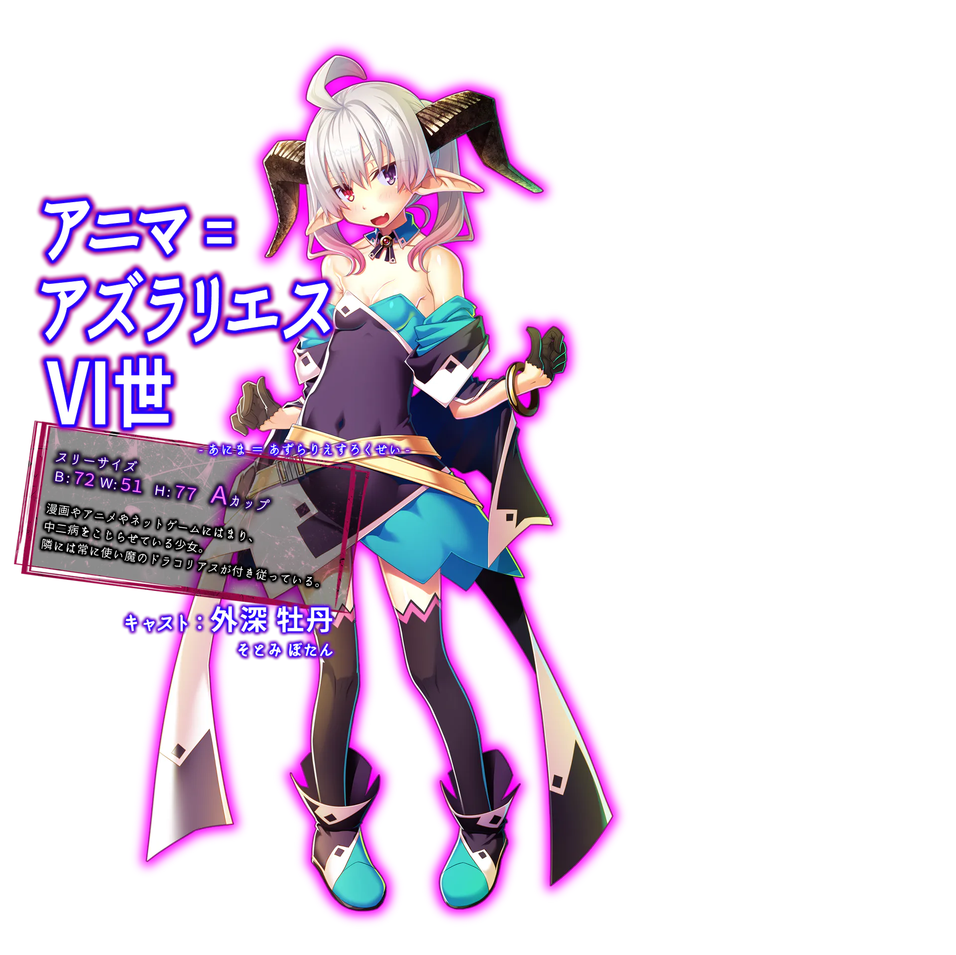 阿妮玛=阿兹拉丽艾丝6世 (アニマ=アズラリエスⅥ世) 三围:B-72 W-51 H-77 重度的漫画、动画、网游宅。 |