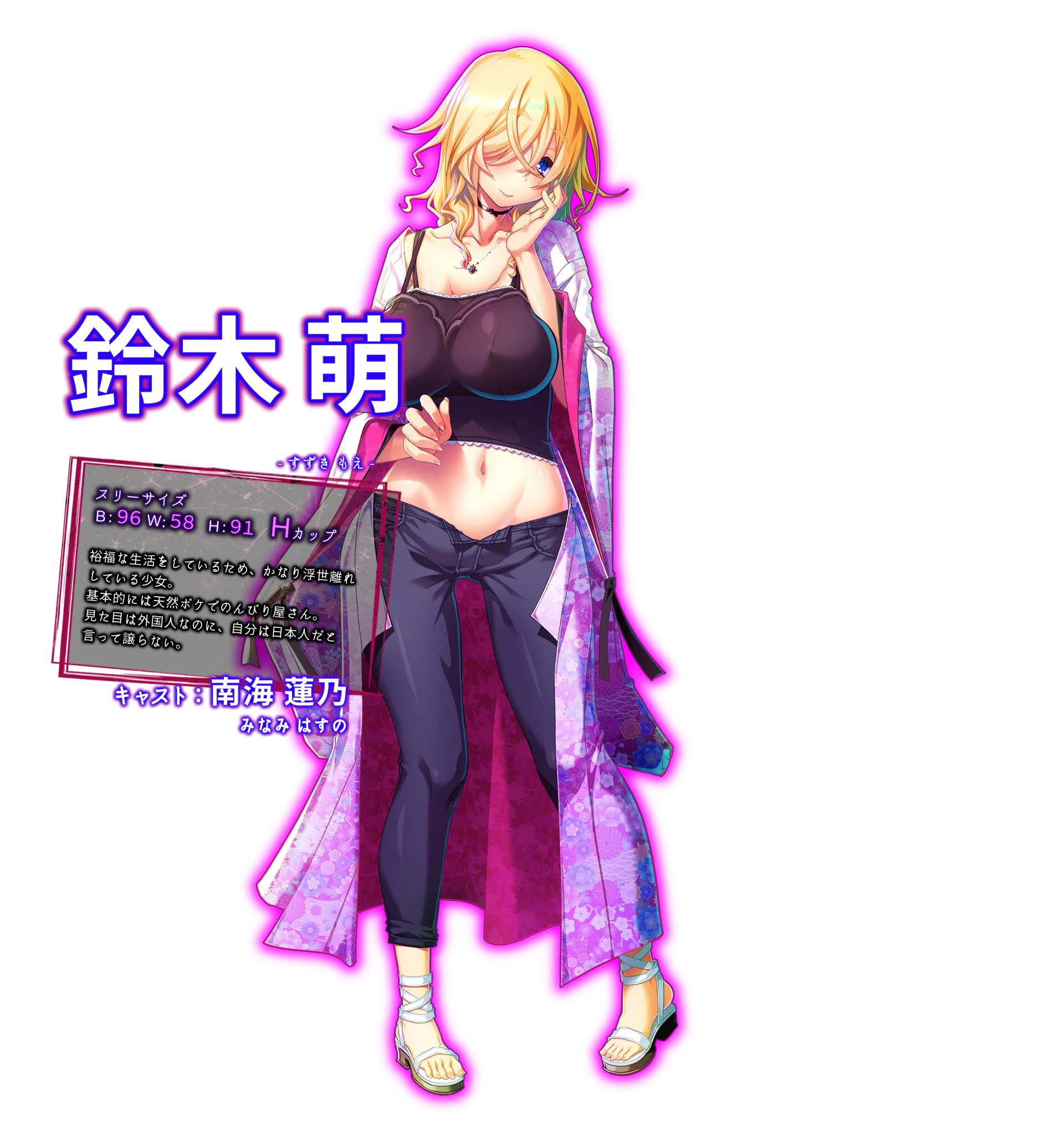 铃木 萌 三围:B-96 W-58 H-91 因为一直过着富裕的上流生活,因而有着不知世事一面的深闺大小姐。 |