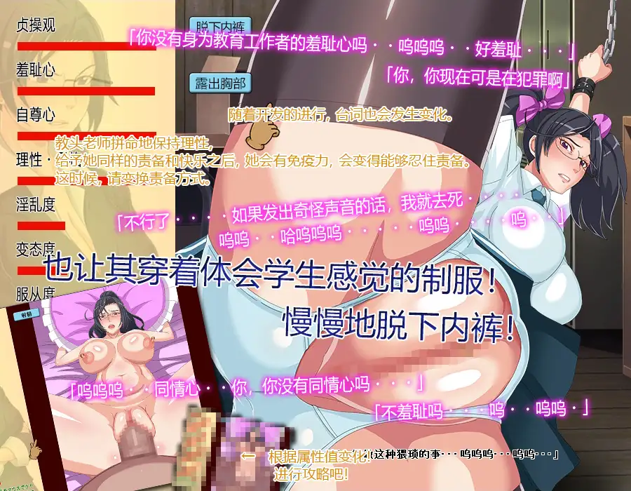 ◆ 序言 这是由我担任校长的女子学校・・・东京淑女学校是全日本纪律最严格的学校。 在这所学校里,男女谈恋爱当然是被禁止的,而且还要在礼仪到贞操观等方面培养学生,使其立志成为淑女。 不能染发,校服为长裙・・・在现在这个时代,我们所追求的也是朴素的校风,而非追赶潮流。 然后,制定学校校规,严格进行管理的人,正是教头菊池香织。 她是一个认真严格遵守规则,毫不通情达理的37岁女人。 有传言称她从未有过性经验,也没有和男人交往过・・・。 典型的错过婚期,把朴素认真作为优点的女教官。 她每天都要严格检查学生的装束、持有品,以及言行举止,总之都是在进行很严格的教导。 内衣和手机通讯记录也要进行检查。 如果再这样下去的话,不仅在校学生,连入学的学生数量也会持续减少。 更严重的是,如果学生继续减少,学校有可能就要倒闭。 由我来说服被称为学校老顽固的菊池香织教头。 ◆ 手绘动画 本游戏为全手绘动画。 使用鼠标进行选择,开发调教的全部场景,均为手绘动画。 ◆ 激烈的动作 更加激烈的台词。 对最初痛骂校长的教头老师,施以严厉的责骂,使其开始哀嚎求饶。 仅仅这样并不能结束・・・ 纠缠不休的严厉责备,会使她开始崩溃,最后丧失理性,开始寻求快乐。 如此激烈的叫喊声,是拜托间中紫织桑配音完成。 ◆ 可以进行多种选择 各个场景中,可以对教头老师,在各种场所中进行责备。 在用鼠标进行选择时,可显示责备内容,请进行参考。 另外,也可以脱她的衣服或内裤。 可以选择是否佩戴眼镜。 根据属性值,最终调教关卡也会发生相应变化。 请让认真的教头老师崩溃吧。 ◆ 属性值&模仿 对严厉教头老师的教育,请慢慢进行。 无视教头老师说的话,不对她进行彻底调教的话 让她成为婊子会比较困难。 即使她求饶,调教也不能结束。 但是,不能一直使用同一种责备方式。 长时间在同一场所进行责备的话,会出现反效果。 请边观察反应(属性值),边放弃责备。 ※ 用鼠标进行选择,右击取消责备。 随着开发的进行,台词也会发生变化。 请使其理性崩坏,把她调教成为灵敏度高的淫乱婊子。 教头老师拼命地保持理性, 给予她同样的责备和快乐之后,她会有免疫力,会变得能够忍住责备。 这时候,请变换责备方式。