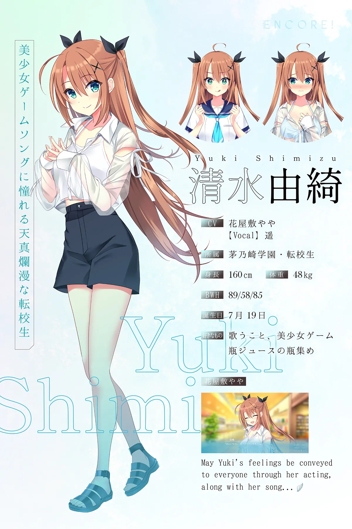 【主唱】 遥 所属 茅乃崎学园・转学生 身高 160cm 体重 48kg 三围 89/58/85 生日 7月19日 爱好 唱歌、美少女游戏 收集瓶装果汁的瓶子 愿由纪的情感能通过她的演技和歌曲传达给每个人……🪶