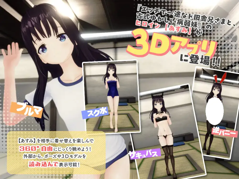 超乡野兄妹的3D换装游戏登场!可自由选择亚澄的服装与配饰进行H互动!镜头能自由移动,从喜欢的视角随意观赏。支持从外部读取VRM格式文件,显示心仪的模型!若再导入动画文件,还能让角色做出任何喜爱的动作!
