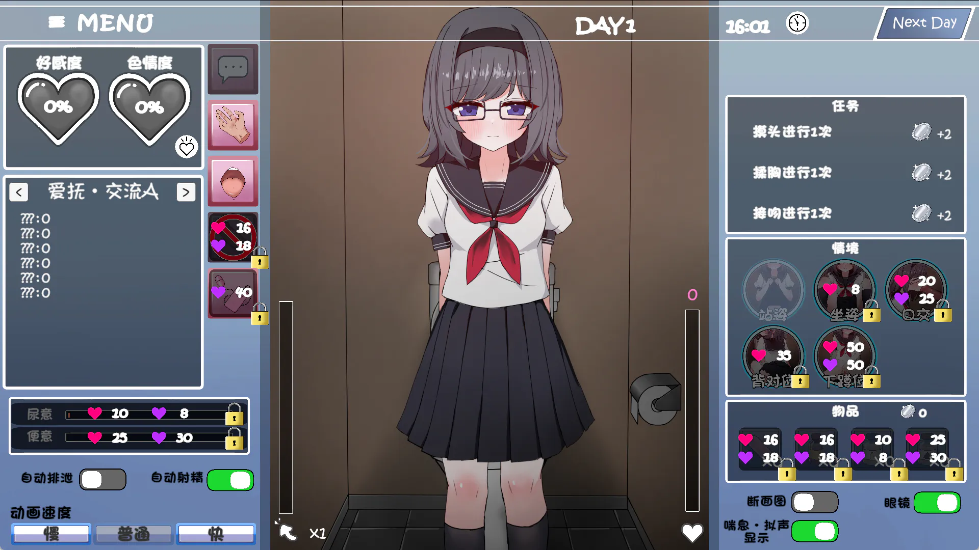 【蹲姿】 让她蹲在马桶上,摆出能清楚看到小穴的姿势自慰,也可以让她在小穴张开的状态下排泄。 ○关于排泄场景 仅限【坐着】【蹲姿】场景,可以让渚沙酱进行小便、大便、精液排泄♡ 也可以使用利尿剂或泻药来促进排泄。 ※排泄表现可以通过设置切换ON/OFF。 衣服穿脱自由!也有穿着制服H的场景 着衣H即是正义……这种心情,我非常理解。 部分情景可以穿着衣服插入、撩开裙子插入等!请用你喜欢的组合来H。 随意触摸的爱抚・交流系统 通过揉胸、接吻等行为, 好感度和H度会上升。 随心所欲地触摸你喜欢的地方,享受渚沙的反应吧。