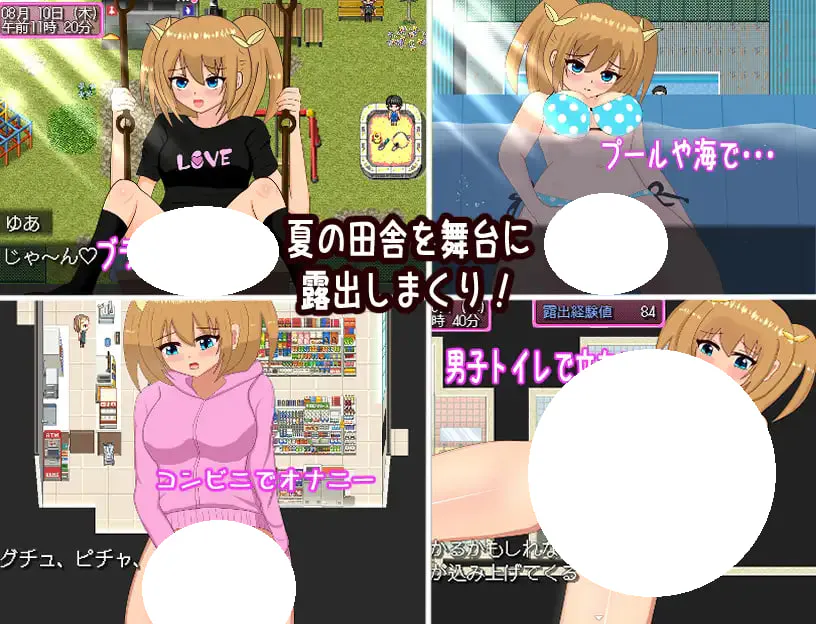 主角优亚在暑假期间前往乡下的亲戚家度过与以暴露为兴趣的土气女孩相遇为契机自身也在野外暴露中逐渐体会到快感……在各种地方暴露吧!