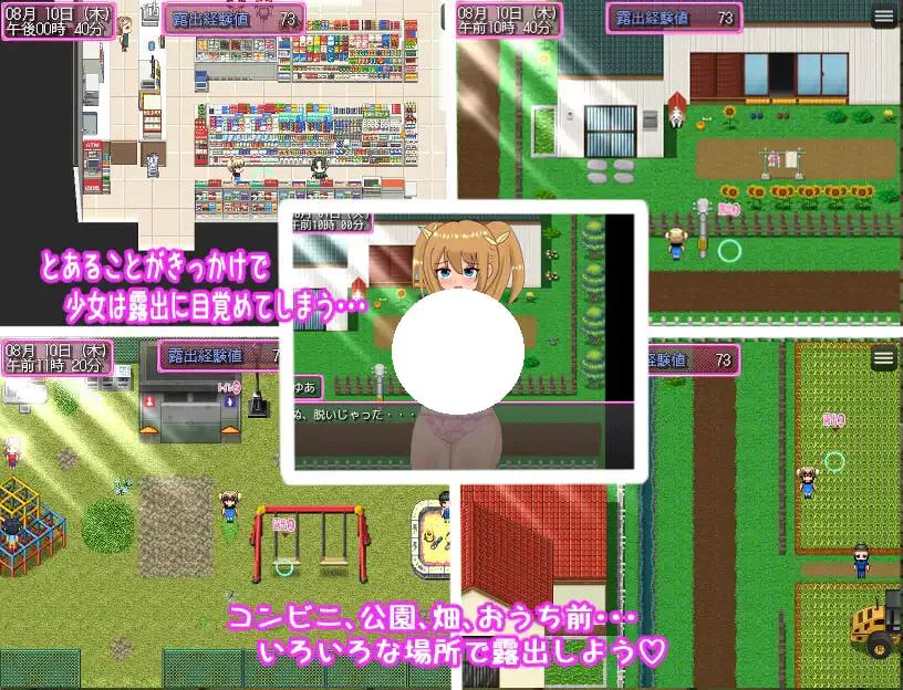 以乡村为舞台四处暴露游走吧!在公园、公交站、便利店等地暴露获取暴露经验值!暴露经验值提升后会变得越来越大胆!充满解放感的暴露!