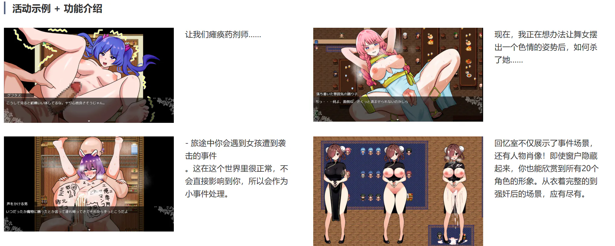 回忆室不仅展示了事件场景,还有人物肖像!即使窗户隐藏起来,你也能欣赏到所有20个角色的形象。从衣着完整的到强奸后的场景,应有尽有。