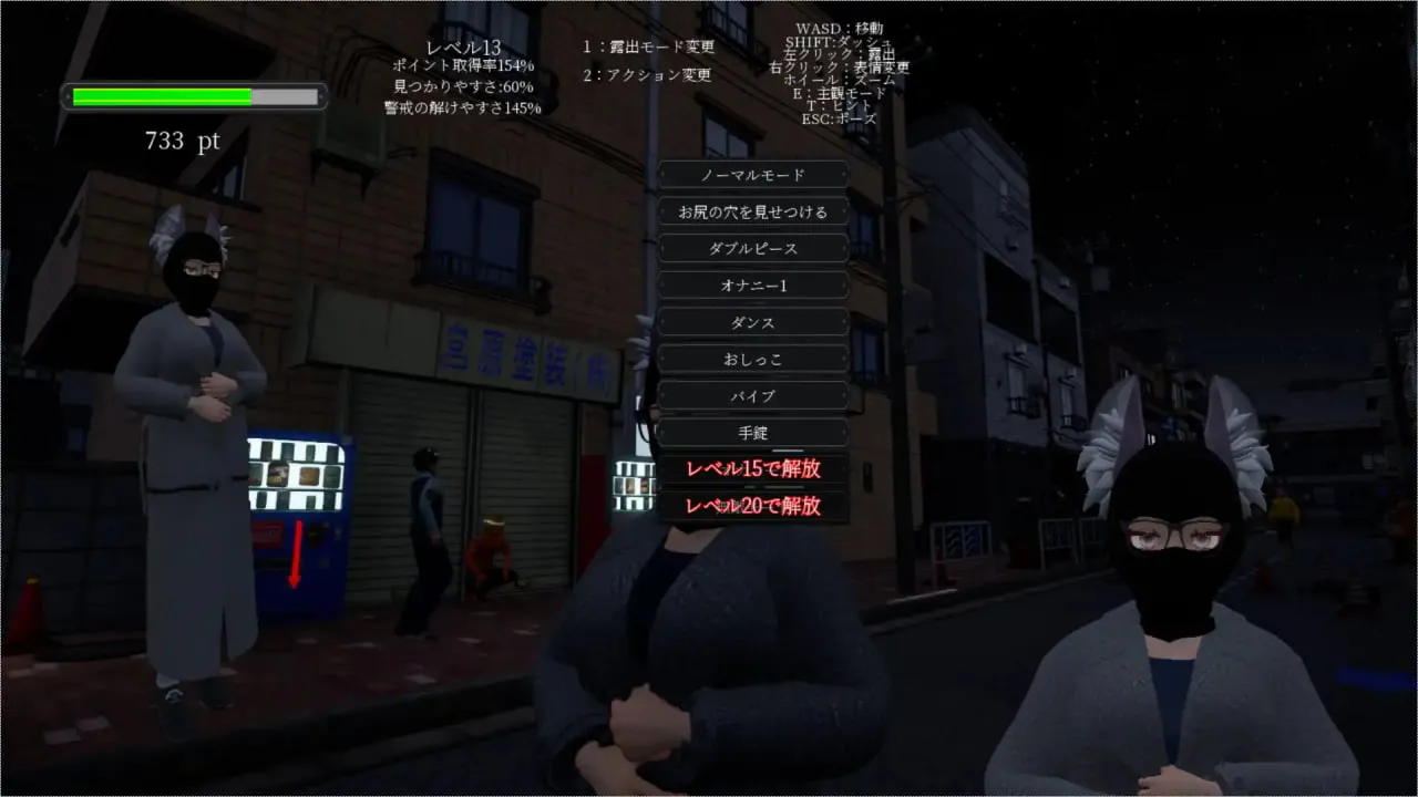 本作不包含被发现后的实战场景,是一款纯粹的露出模拟游戏。搭载了可以自由露出的无敌模式。支持主观视角模式。若过度进行自定义设置,可能会导致模型出现崩坏。