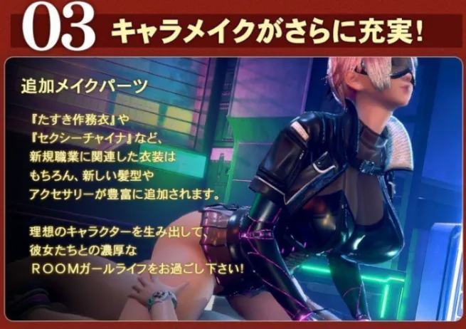 《Room Girl》是I社开发的一款恋爱模拟新作,铺垫许久的I社新作《RoomGirl》拥有新开发技术带来的压倒性透明感,在于人体、服饰上会有更高级质感的体现I社版模拟人生,享受各种工作、约会、告白、打扑克等精彩生活瞬间。打扑克的场景在光影效果、空气感等视效方面得到巨幅强化,可以在诊所、爱情旅馆、办公室、俱乐部等场所展开互动。