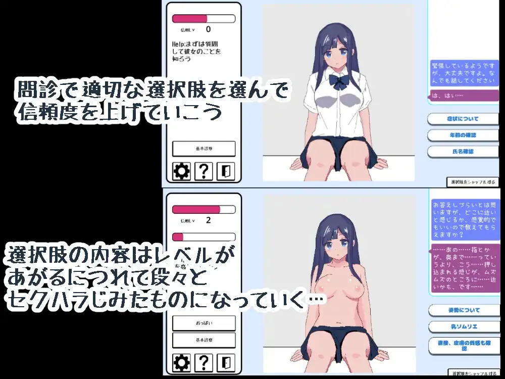 这是一个简单的诊疗场景游戏。包含一些性骚扰对话和触摸要素。最终会发展到全裸性爱。