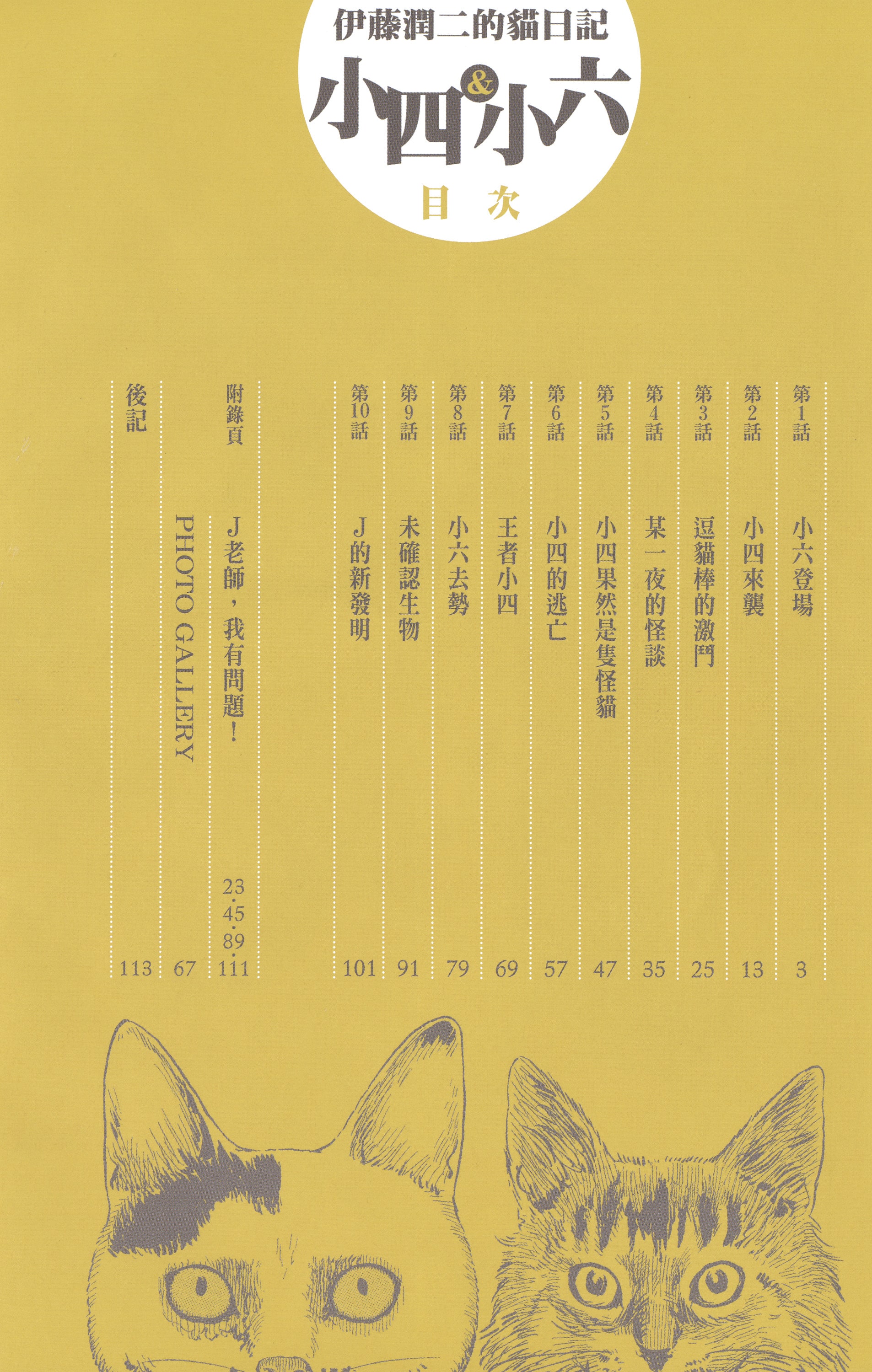 日本恐怖漫画界的代表作家伊藤润二=恐怖漫画家J。喜欢养狗的J不敌未婚妻A子的柔情攻势,被迫在家养了一只西洋品种的幼猫小六、以及一脸妖猫模样的撒娇鬼小四。这两只娇客完全不肯亲近J,让J的心里十分不是滋味。......加油吧,J!恐怖与搞笑只是一线之隔。恐怖漫画家的搞笑猫咪漫画!