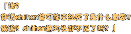 友人。死亡。 霜雪 しほん(しもゆき しほん) CV:猫村ゆき 身長:159センチ 空丘夕陽の親友。 自分勝手な性格だけど手に負えないほどの甘え上手なので、自分の思い通りに物事を進めることができる。 空丘夕陽に異常なこだわりを見せて、いつもラブラブしたがっている。 何者かに殺されて首を切断され、頭部をどこかに隠されてしまう。 |